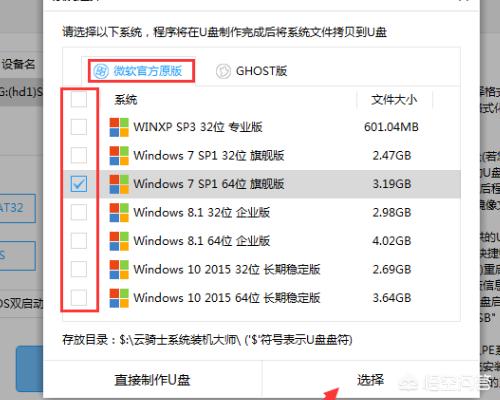 5、紧接着是“系统选择”功能,云骑士在制作U盘启动盘同时提供了【微软官方原版】和【GHOST版】的系统下载,可以顺便勾选你需要的系统,因为系统文件较大在制作PE系统过程会有点久,请大家耐心等待一下。