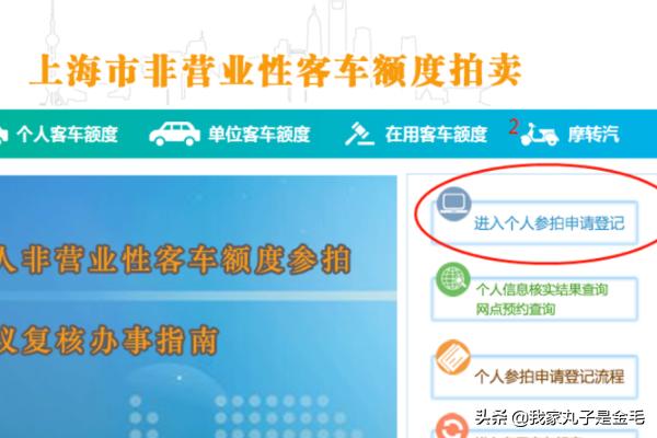 1、搜索“上海市非营业性客车额度拍卖”,然后点击官网进去操作。点击个人参拍申请登记,如图操作所示: