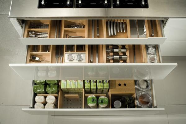 确保足够的存储是主要的厨房设计考虑,根据器具的形状所设置的格子抽屉能使容纳的空间更大,分类放置也更有条理。
