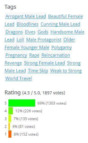 排名第一的《逆天邪神》的标签及评分,其中出现了大量诸如“强力的男主”“血统”“重生”“一夫多妻”“由弱变强”等外国读者最热衷的内容。另外,69%的读者为其打出了五星的评分。