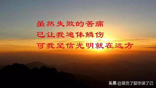 第五首,对于生活中的挫折与迷茫,汪峰《光明》,“相信未来会给我一双梦想的翅膀”“虽然失败的苦痛,已让我遍体鳞伤,可我坚信光明就在远方”不管遇到多少挫折,都要坚信未来是光明的,指引我勇敢向前,迈向远方。