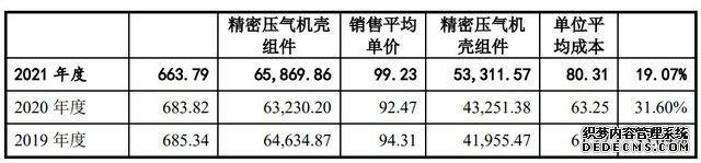 从锡南科技披露的数据来看,公司精密压气机壳组件成本从2019年的61。22元/件上升至80。31元/件,成本上涨19。09元/件,而销售仅从94。31元/件提升至99。23元/件,仅涨价4。92元/件,由于成本上涨过高,公司毛利率也从35。09%下降至19。07%。