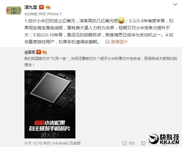 业内人士潘九堂透露,2014年得知小米在搞芯片的时候,当时就震惊了。三年内样品能演示就算成功,第一款芯片肯定还差苹果、三星、华为处理器很远,但如此短时间能商用,已算牛逼起步了,很多整机企业忽悠搞芯片很多年终不见动静。