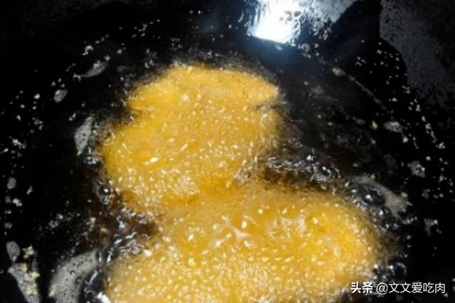 6、锅里热油,测油温照旧用筷子立在油中,筷子周围开始起密集的小泡泡并往外扩散,油温就合适了。把鸡胸肉放下去炸,炸至两面金黄就可以了。