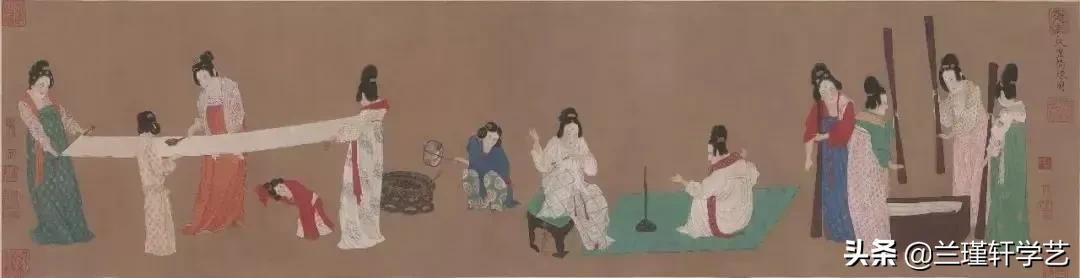 其实这幅画经过兵荒马乱的时代,原迹早已散佚,现存的已是宋徽宗摹本,此画我们可以看见金章宗用瘦金体题写着“天水摹张萱捣练图”几字。
