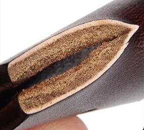 因为头层牛皮纤维相对细密柔软,还有天然毛孔,在染色喷涂时不需要像二层牛皮喷涂那么厚。尤其是在用在鞋子上,所以不管是透气性,柔韧性,舒适度还是档次都比二层皮好,而且不容易臭脚和捂脚。