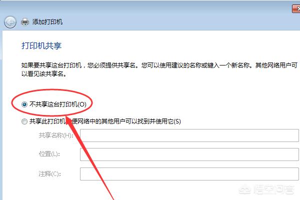 4、之后,按照提示添加打印机,若是不需要共享直接勾选不共享即可,再点击下一步。