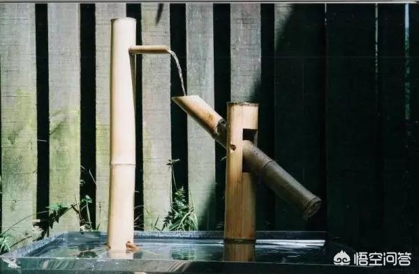 鹿威也叫添水,当竹筒里蓄满流水,向下翻倒,敲击在池塘边的石头上,发出清脆“嘟”的一声,将水倒入池塘里,接着又弹起,循环往复。这主要是用来驱逐鸟群的,如果是家中庭院可做装饰用。