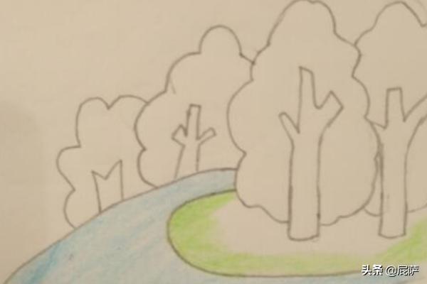 5、然后我们在小溪的旁边再画上两棵树,画法如下步骤,如图所示。