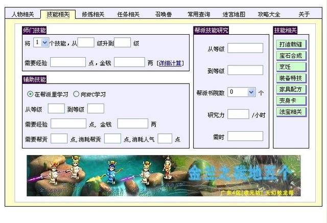 2、在门派技能经验计算中,增加了“详细”按钮。可进入更详细的门派技能经验计算中。因为门派技能有七个,所以可以分成七项来计算,最后再把七项的经验和金钱相加,得到了总的经验和总的金钱。