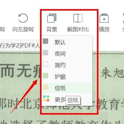 第四个惊艳功能:背景切换,护眼很简单。很多时候,用PDF是读电子书,那么调整背景颜色很实用。这款软件贴心的“一键背景切换”功能非常实用。请看下图: