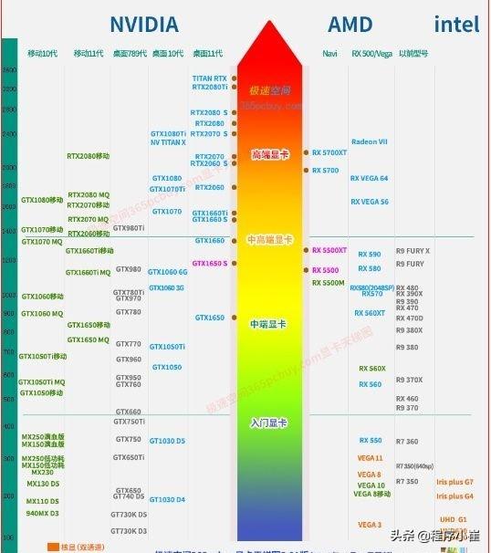 同样有CPU天梯图就会有显卡天梯图,不懂的小白可以直接看天梯图即可一目了然知道哪个卡最具性价比,性能哪个强哪个弱也是一眼即可发现。