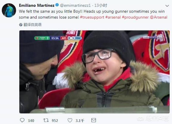 枪手外租门将马丁内斯也表示:小男孩,我们和你感同身受!抬起头来,年轻的枪手,你有时会取得胜利,有时也会遭受失败。#真爱 #阿森纳 #枪手骄傲