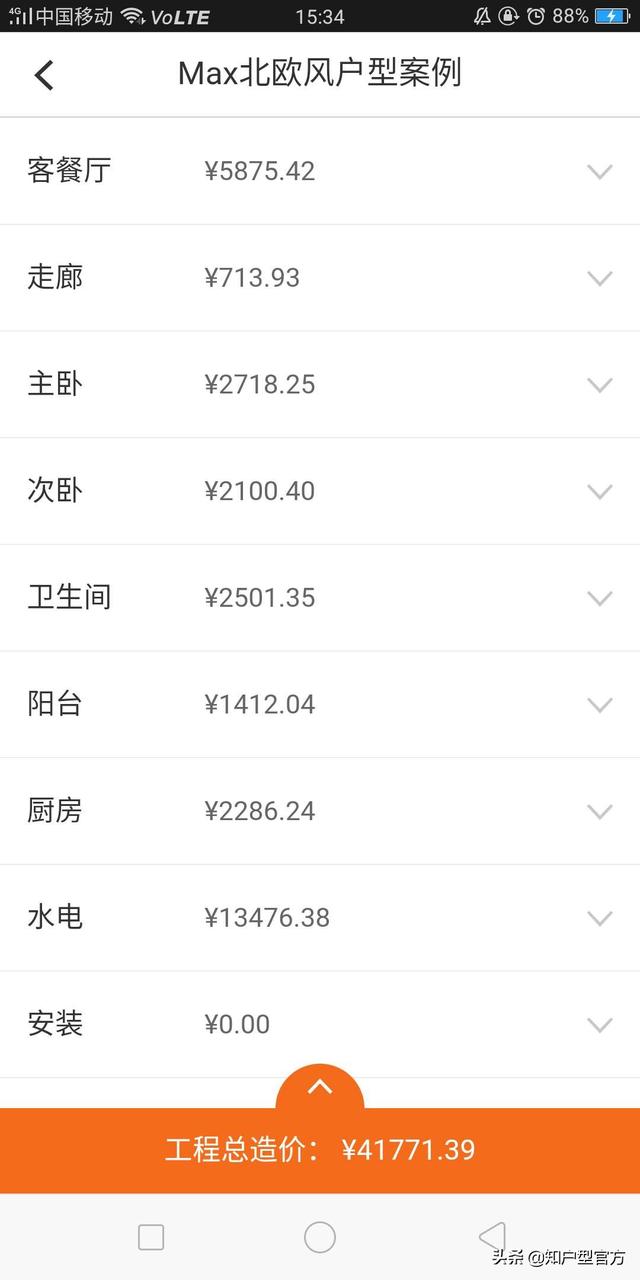 选择户型空间,根据材料及单价,进行工程总报价输出。