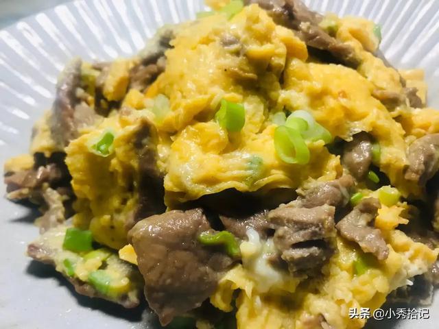 做法:牛里脊逆纹切薄片,用除酱油外的调味抓腌备用,起锅爆香姜蒜末下牛肉快炒,7分熟取出,连同葱花酱油加入蛋液里,锅洗净入两大勺的油,大火烧到有微烟飘出,倒入牛肉蛋液,看到锅边蛋液起了裙边立马关火,利用余温将食材烹熟。