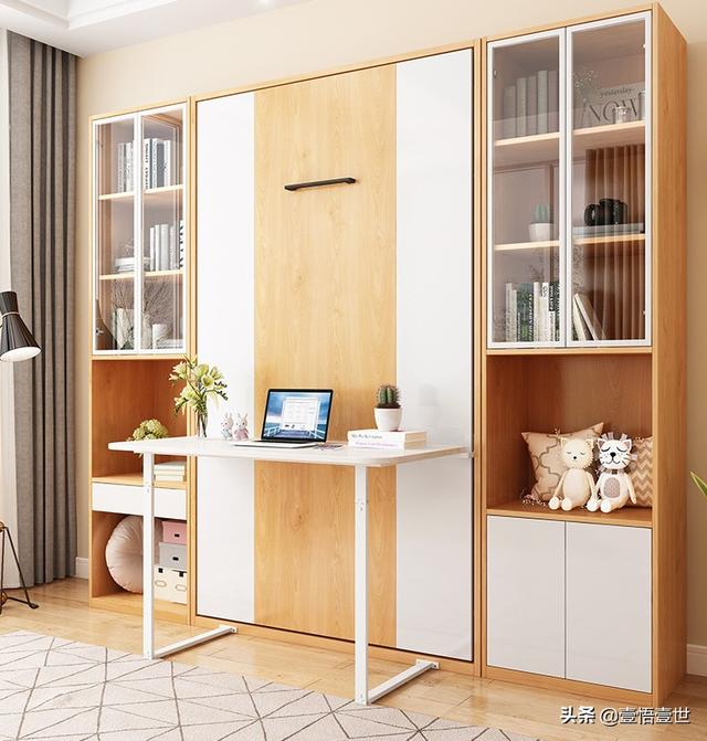 5、主卧往北2500mm靠墙放置多功能隐形折叠床加两个书柜(如下图所示)尺寸为:600mm+1300mm+600mm,平时立在墙边为两个书柜加一个学习桌,作为书房空间;睡觉时将隐形床放下,成为两个书柜加一个1.3米的床,作为卧室空间。如此可最大限度的节约空间,让空间显得整洁、宽敞,该区域采用吊顶轨道拉帘来解决隐私问题,形成一个次卧空间;