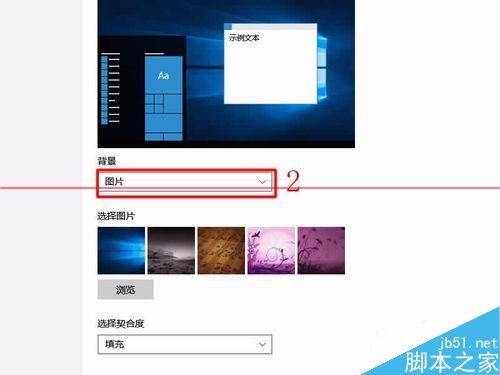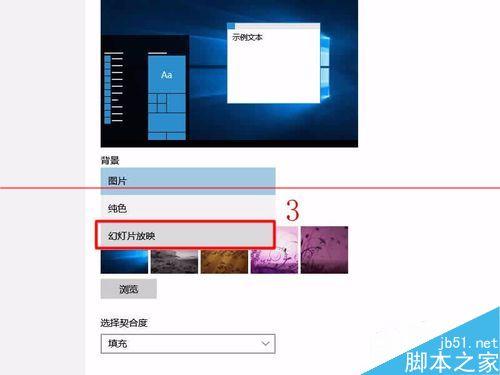 3、最后在系统自带的几张壁纸当中选择一种,我们还可以进行契合度选择设置,以及背景是以图片,纯色还是幻灯片放映形式存在,如下图所示: