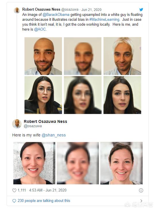 这意味着每张去像素化的图像都可以以各种方式进行放大,就像一套食材可以做出不同的菜肴一样。并不是像 "放大和增强 "的套路那样,算法是在图像中 “发现 ”新的细节,而是在发明新的面孔,还原输入数据。这种工作在理论上已经有几年的时间了,但是,就像人工智能世界经常发生的那样,当本周末在网上分享了一个易于运行的代码版本时,它引起了更多人的关注。这时,种族差异开始跃然纸上。