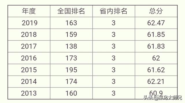 这个是菜鸟整理的云南师范大学最近几年的排名情况。省内的排名菜鸟就不多说了,因为一直非常稳定的排在第三名的位置。至于在全国的排名,其实浮动还是比较大的,最好一次的排名是全国第138名,到2019年的时候,在全国的排名是第163名,大家可以看看。