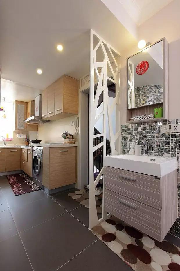 ▲进门处。一进门便是一个开放式厨房,从视觉上立刻让家变大了,左手边充分利用空间做了一个洗手台,并用镂空挡板做装饰。看上去很美观。