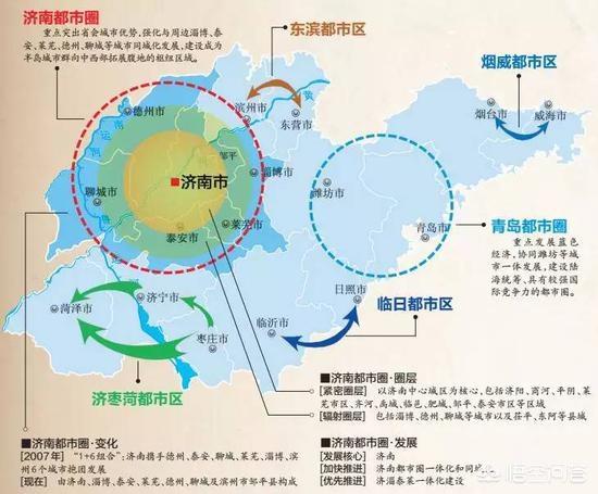 济南都市圈:重点突出省会城市优势,强化与周边淄博、泰安、莱芜、德州、聊城等城市同城化发展,建设成为半岛城市群向中西部拓展腹地的枢纽区域;
